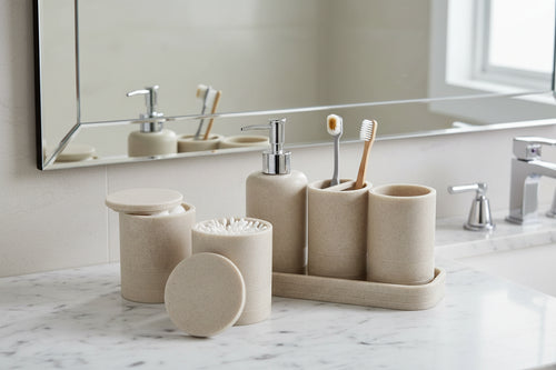 6-Piece Stone-Textured Bathroom Accessory Set | Modern Polyresin Vanity Organizer (Beige)